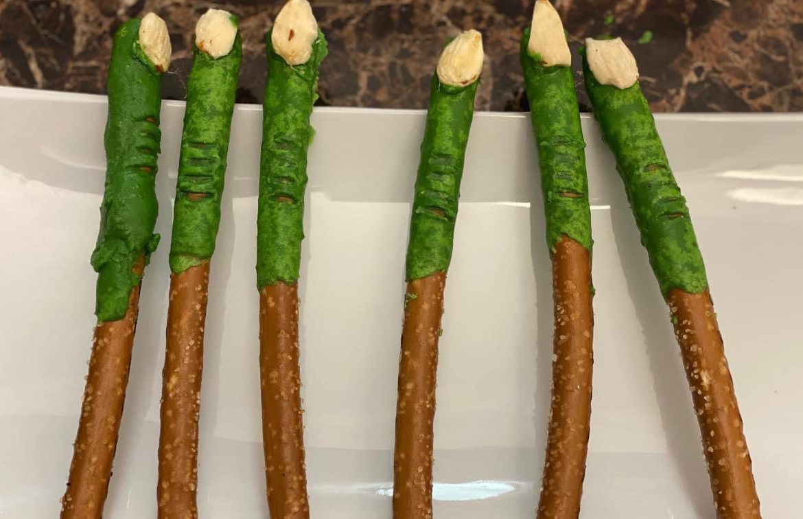 These Witch Fingers have been made with Pretzel Rods dipped in green Candy melts. Nails have been polished with Sliced almonds.